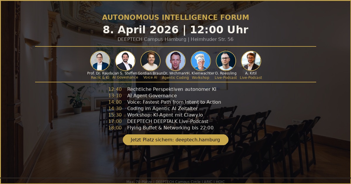 Das Autonomous Intelligence Forum ist die erste Konferenz des DEEPTECH Campus Circle. Am 8. April 2026 treffen sich Experten und Entscheider im DEEPTECH Campus Hamburg, um die drängendsten Fragen rund um autonome KI zu diskutieren: Agentische Systeme, Governance, Haftung, Voice AI und die praktische Umsetzung in Unternehmen.